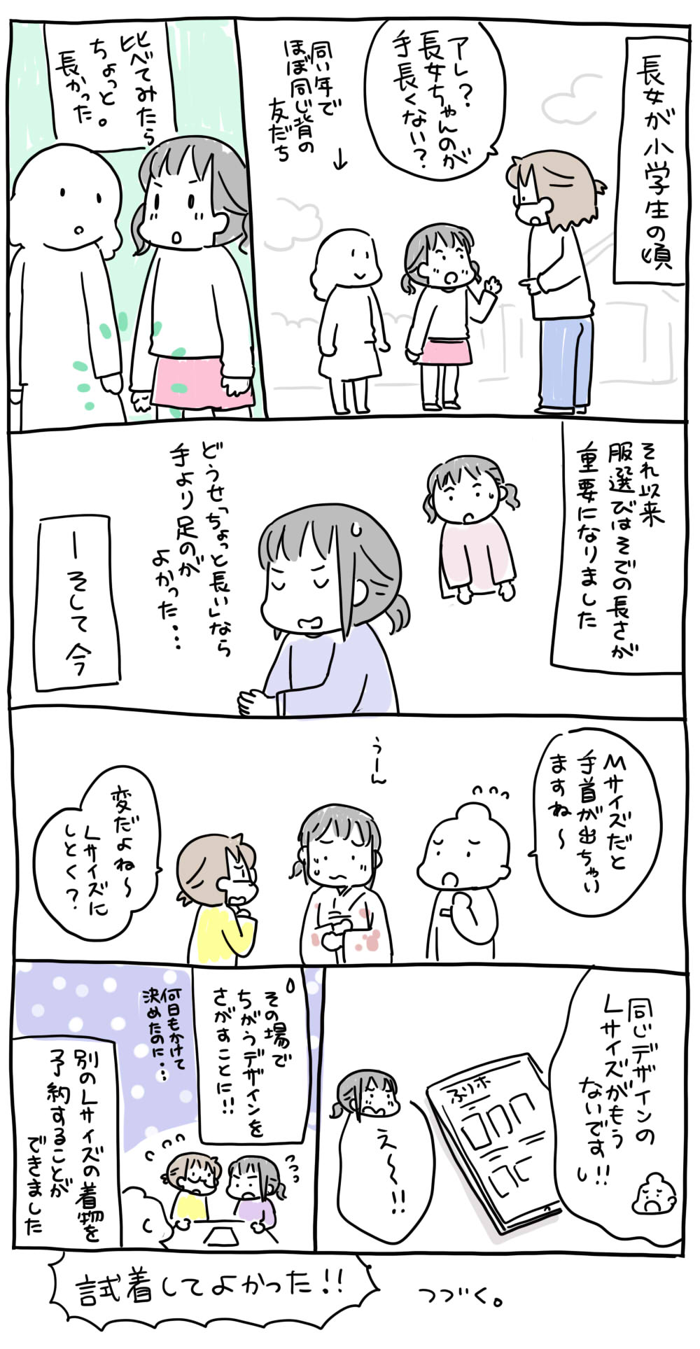 長女の成人式・その4 2023年02月03日 カテゴリ: お姉ちゃん(長女) |長女の成人式 今までの話↓長女の成人式の話その1 その2 その3振袖を試着することになった長女なのですが袖がちょっと短かった!!というか腕がちょっと長かった!急遽MサイズからLサイズへ変更することに。しかし同じデザインの振袖のLサイズはもう予約終わってた…結局、家で選んでいたときに候補に挙がっていた振袖を予約できました~。本当に…試着してみてよかった~~ためしに着てみますか?と提案してくれた店員さんありがとう!!つづく☆ウーマンエキサイトさんで「4人の子ども育ててます」連載中です。記事一覧>4人子ども育ててます 目次☆元気ママ応援プロジェクトで育児あるある漫画書いてます。記事一覧>ゆずぽん♡公認ママサポーター さんのまとめ↓アイコン屋さんやってます仕事依頼などのお問い合わせはこちらまで>>mail現在コメ欄は閉じてます。ツイッターで反応いただけると嬉しいです>twitterランキングに参加してます。応援クリックお願いします。 ↓LINEで更新のお知らせが届きます 「お姉ちゃん(長女)」カテゴリの最新記事 タグ :#お姉ちゃん20歳#長女#長女の成人式#振袖