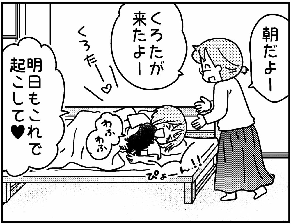 ゆずぽんさんち「モーニングくろた」 2024年07月20日 カテゴリ: 連載・ゆずぽんさんち |ちい(次女) とにかく朝なかなか起きない次女・・・起こす私と旦那は毎朝疲弊しています。わんこを投入させると、ご機嫌で起きることが判明!さすがくろた!えらいぞ、くろた!!!↓↓ライブドアアプリでの読者登録はこちらから(アプリDL後に「おやこぐらし。」で検索して登録してね仕事の依頼はサイドバーにあるメールフォームからお願いします現在コメ欄は閉じてます。X(旧Twitter)で反応いただけると嬉しいです>こちら☆ウーマンエキサイトさんで「4人の子ども育ててます」連載中です。最新記事>嫌いなお手伝いは食器洗い…そんな次男が急に食器を洗いだした理由とは?過去記事一覧>4人子ども育ててます 目次☆元気ママ応援プロジェクトで育児あるある漫画書いてます。最新記事>【育児漫画】次男の学校到着スタンプ過去記事一覧>ゆずぽん♡公認ママサポーター さんのまとめランキングに参加してます。応援クリックお願いします。