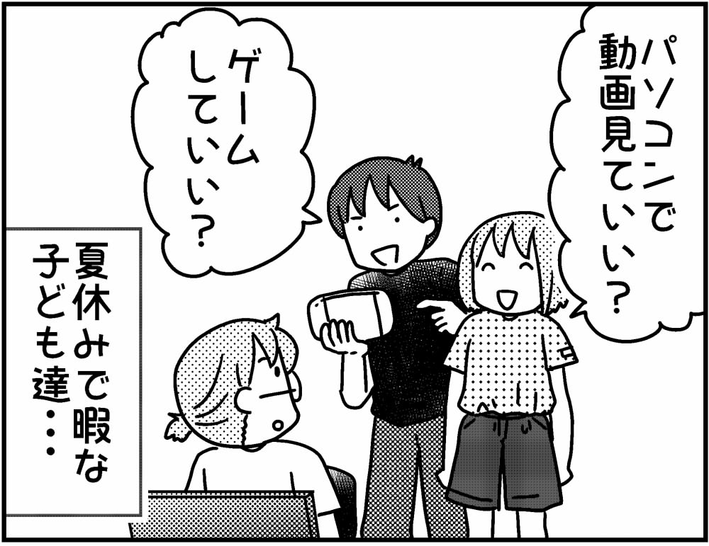 ゆずぽんさんち「夏休みの攻防」 2024年09月11日 カテゴリ: 連載・ゆずぽんさんち |こどもたち 夏休み中の話家で暇してるなら、少しでも手伝ってほしいのです!★住宅会社のニュースレターにて「ゆずぽんさんちは6人家族」好評連載中です♪このマンガはニュースレターからの再録です。↓↓ライブドアアプリでの読者登録はこちらから(アプリDL後に「おやこぐらし。」で検索して登録してね☆ウーマンエキサイトさんで「4人の子ども育ててます」連載中です。記事一覧>4人子ども育ててます 目次☆元気ママ応援プロジェクトで育児あるある漫画書いてます。記事一覧>ゆずぽん♡公認ママサポーター さんのまとめ仕事の依頼はサイドバーにあるメールフォームからお願いします現在コメ欄は閉じてます。X(旧Twitter)で反応いただけると嬉しいです>こちらランキングに参加してます。応援クリックお願いします。