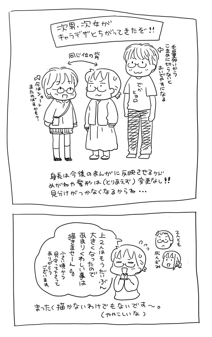 再び辰年 2024年01月01日 カテゴリ: こどもたち 2024年!あけましておめでとうございます~なんと…このブログ、12年前の記事もあったりします>「辰年」次女が生まれる前ですよ~!懐かしいねえ(2006年からブログやってるんですよ…長っ!!!)そして本日の絵日記はこちら↓今後の方針のお知らせも兼ねてます。長男長女はもう成人済みなので、あまり詳しいことは書かずにさらっと出てくる感じになると思います!ご了承くださいませー!そんでもって、次男次女がすくすく育ちすぎて当時のキャラデザと全然違うことになってきた・・・!(一応微妙に変化させたりしてたけど!)しかし髪型は頻繁に変わったりするし(特に次女)ブログ内では見た目はそのままで、身長だけリアルにしようかな~と思ってます。次男はすっかり私の身長を越えて見下ろしてます…次女にぬかされるのも時間の問題だろうなあ…。そんなこんなの我が家ですが、今年もよろしくお願いしますー!!!近いうちに新シリーズはじめるよ~見てね~!<お願い> LINEでの更新のお知らせサービス終了しました~↓↓ぜひライブドアアプリでの読者登録をお願いします!☆ウーマンエキサイトさんで「4人の子ども育ててます」連載中です。記事一覧>4人子ども育ててます 目次☆元気ママ応援プロジェクトで育児あるある漫画書いてます。記事一覧>ゆずぽん♡公認ママサポーター さんのまとめ仕事の依頼はサイドバーにあるメールフォームからお願いします現在コメ欄は閉じてます。X(旧Twitter)で反応いただけると嬉しいです>こちらランキングに参加してます。応援クリックお願いします。
