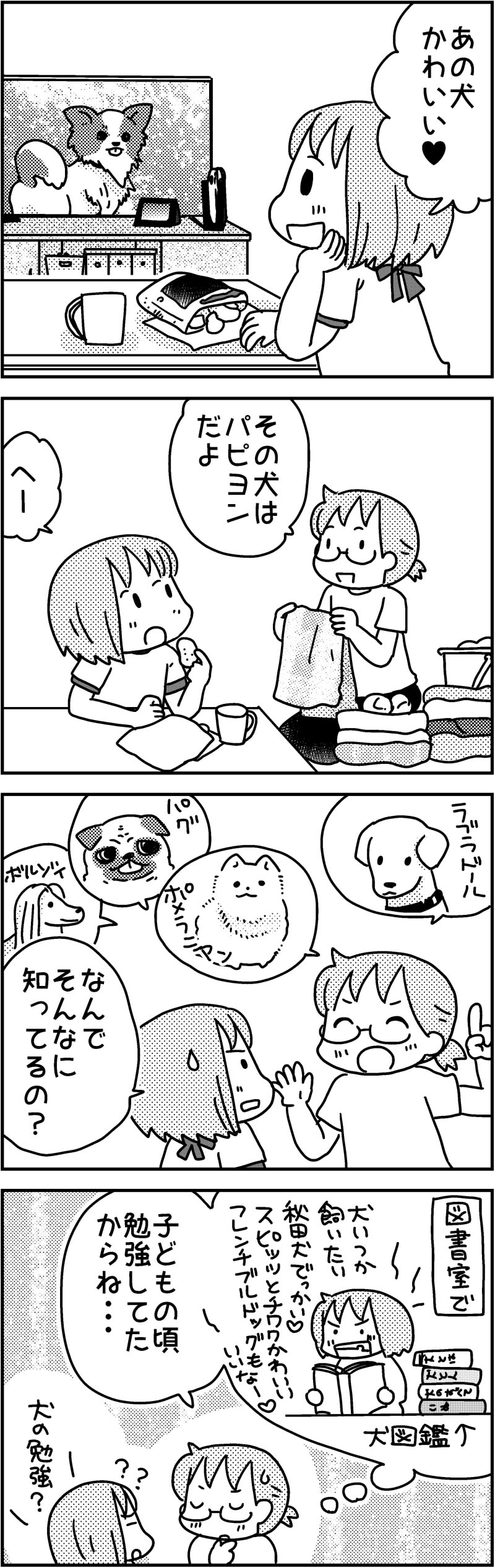 ゆずぽんさんち「犬の勉強」 2022年08月14日 カテゴリ: 連載・ゆずぽんさんち |ちい(次女) 一時期、延々と犬図鑑を読んでた時期がありまして犬種とか犬の性格について、無駄に詳しい私です・・・。あのころ英語にはまっておけば、今頃ペラペラだったのかも!★住宅会社のニュースレターにて「ゆずぽんさんちは6人家族」好評連載中です♪このマンガはニュースレターからの再録です。 ☆ママスタセレクトさんで漫画を担当した記事が公開中!<息子の彼女がかわい〜!>【前編まんが】<息子の彼女がかわい〜!>【中編まんが】<息子の彼女がかわい〜!>【後編まんが】☆ウーマンエキサイトさんで「4人の子ども育ててます」連載中です。最新記事>スマホケースを買い替えたい次男…「あと1クリックで注文確定!」で判明した思わぬ事態記事一覧>4人子ども育ててます 目次☆元気ママ応援プロジェクトで育児あるある漫画書いてます。記事一覧>ゆずぽん♡公認ママサポーター さんのまとめ仕事依頼などのお問い合わせはこちらまで>>mail現在コメ欄は閉じてます。ツイッターで反応いただけると嬉しいです>twitterランキングに参加してます。応援クリックお願いします。 ↓LINEで更新のお知らせが届きます