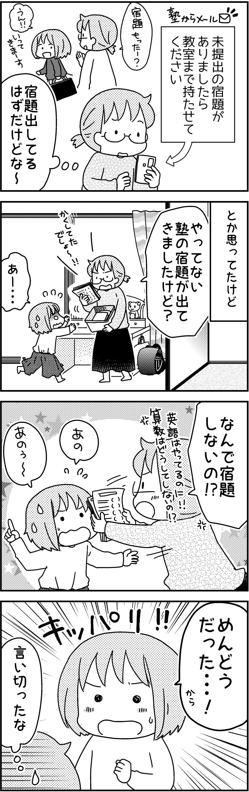 ゆずぽんさんち「言い切った次女」 2022年04月15日 カテゴリ: 連載・ゆずぽんさんち |ちい(次女) ちょっと前から公文に通っている次女。英語(大好き!楽しい!宿題も進んでする)と算数(できればやりたくない…)を選択しています。そんな次女の宿題事情。言い切った~~~~!!!!ふつう思ってても言わないのでは!!!??算数の宿題だけがどっさり隠されておりました…。英語は全部提出したらしいよ…。すごい量だったので3日くらいに分けてやりました。いくらめんどうでも今後は宿題をためないようにお願いしますよ~~~!!★住宅会社のニュースレターにて「ゆずぽんさんちは6人家族」好評連載中です♪このマンガはニュースレターからの再録です。☆ウーマンエキサイトさんで「4人の子ども育ててます」連載中です。記事一覧>4人子ども育ててます 目次☆元気ママ応援プロジェクトで育児あるある漫画書いてます。記事一覧>ゆずぽん♡公認ママサポーター さんのまとめ↓アイコン屋さんやってます仕事依頼などのお問い合わせはこちらまで>>mail現在コメ欄は閉じてます。ツイッターで反応いただけると嬉しいです>twitterランキングに参加してます。応援クリックお願いします。 ↓LINEで更新のお知らせが届きます