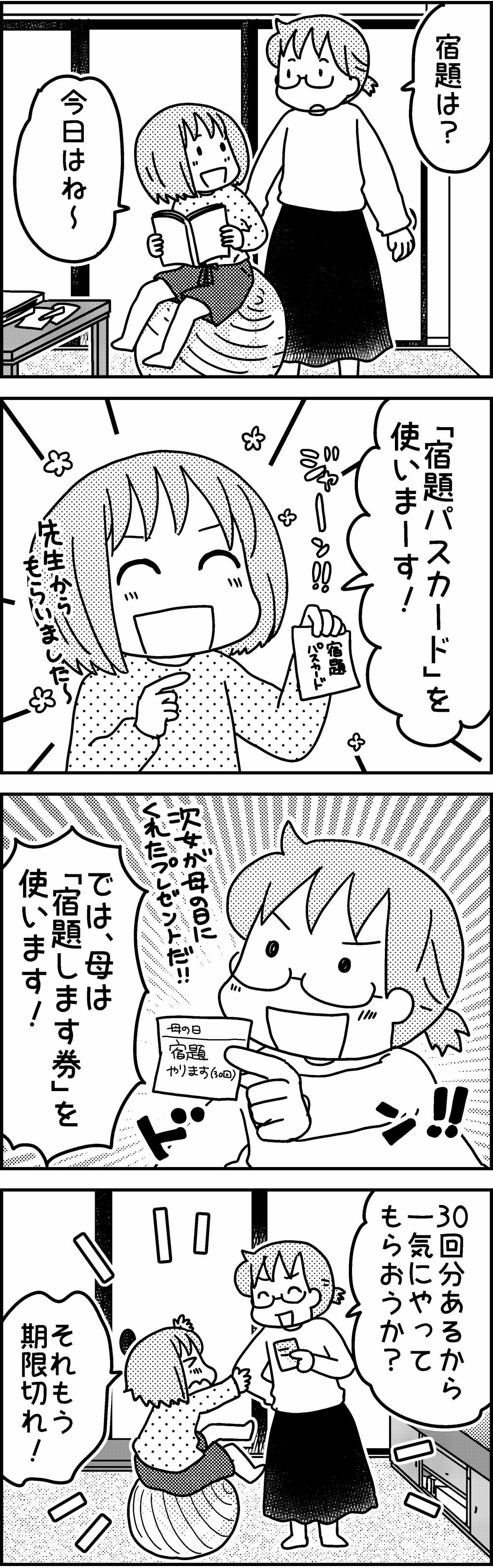 ゆずぽんさんち「母娘バトル!」 2022年11月21日 カテゴリ: ちい(次女) |連載・ゆずぽんさんち ★住宅会社のニュースレターにて「ゆずぽんさんちは6人家族」好評連載中です♪このマンガはニュースレターからの再録です。次女からもらった「宿題やる券」いっぱいあるんだけどいざ使おうとしたら拒否されることが多いのです・・・!!☆ウーマンエキサイトさんで「4人の子ども育ててます」連載中です。記事一覧>4人子ども育ててます 目次☆元気ママ応援プロジェクトで育児あるある漫画書いてます。記事一覧>ゆずぽん♡公認ママサポーター さんのまとめ↓アイコン屋さんやってます仕事依頼などのお問い合わせはこちらまで>>mail現在コメ欄は閉じてます。ツイッターで反応いただけると嬉しいです>twitterランキングに参加してます。応援クリックお願いします。 ↓LINEで更新のお知らせが届きます